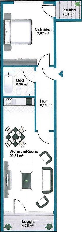 Größe der Wohnung mit Balkon und Loggia: 65 m²